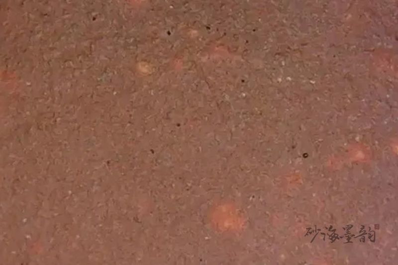上图是朱泥壶与显微镜下的图片,反光点细小而密集,细微密集的光点,视觉上就是润光。