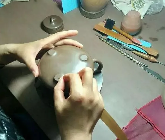明针,不仅仅是把紫砂壶表面压平刮整,也会使较细的颗粒(俗称浆)溢上表面。