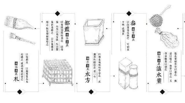唐陆羽撰《茶经》,在四之器中,将饮茶器具分为8大类24种共29件。其中生火燃具有风炉、灰承、筥、炭挝、火?;煎茶用具有鍑、交床;炙茶和碾茶用具有竹?、纸囊、碾、拂末、罗合、则;贮水和存盐贮具有水方、漉水囊、瓢、熟孟、鹾簋、揭;盛茶和清洁用具有碗、畚、札、涤方、滓方、巾;茶器贮具有具列、都篮等。
