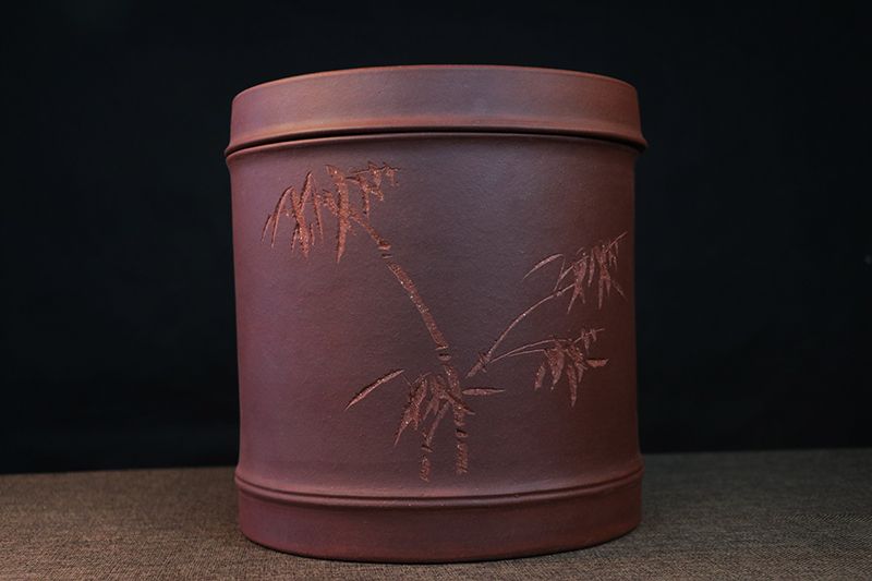 紫砂罐多采用泥绘或彩绘装饰,与壶不同的是,罐体无需装嘴、把,有更广阔的创作空间。
