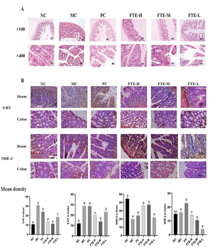 湖南农业大学刘仲华院士团队假设茯砖茶水提取物可通过其抗炎特性来防止腹泻的发展,利用番泻叶水提取物建立小鼠腹泻模型,评价高、中、低不同剂量(分别为2 530 mg/kg 、1 260 mg/kg和630 mg/kg)茯砖茶水提取物的抗腹泻活性;此外,通过组织病理学分析检查小鼠回肠组织损伤、利用免疫吸附测定(ELISA)和免疫组化染色(IHC)检测血清和肠道中血清素5-HT的表达量、IHC和RT-qPCR测定了肠道中钠氢交换蛋白NHE-1和NHE-3的表达量(图2)。