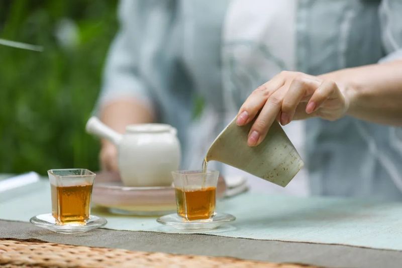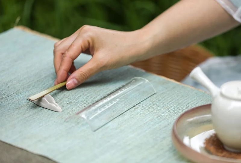 草编防水茶席搭配薄荷绿席布,呼应茶饼面的整体色调。