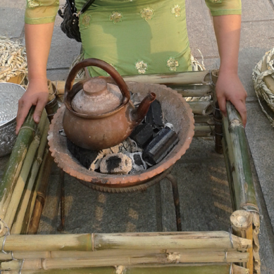 是傣族、拉祜族人民世代相袭的一道待客的传统茶饮。傣族、拉祜族是与竹子相伴的民族,将茶放入新鲜的竹筒中,将其口封紧,放在火塘上烘烤备热,烤至发出茶叶清香,取下加入适量的蜂蜜,然后将沸腾的山泉水倒入竹筒中,再烤煮片刻,即可饮用。