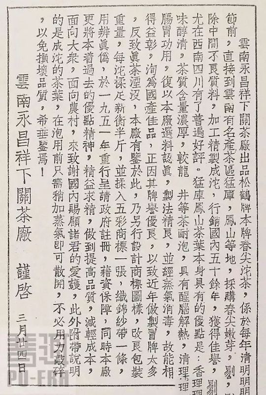 就在彭永昌退出的这一年,永昌祥改革工艺,生产了十担窝头型的沱茶,销往四川。试制阶段的沱茶可能仍是用思茅和勐库原料,因为那时凤庆种茶时间不长,名气也较小。从他们1923年注册的商标上我们可以看到,“本记向在云南迤西下关,不惜工本由普洱各茶山自行提办春尖普茶,发各埠销售。贵商光顾,请认招牌为记。”可见,到1923年的时候,他们还没有主打凤庆、勐库牌,而是说自己卖的是“上品普茶”。早期的沱茶由于较多地采用普洱茶,汤色介于红绿茶之间。
