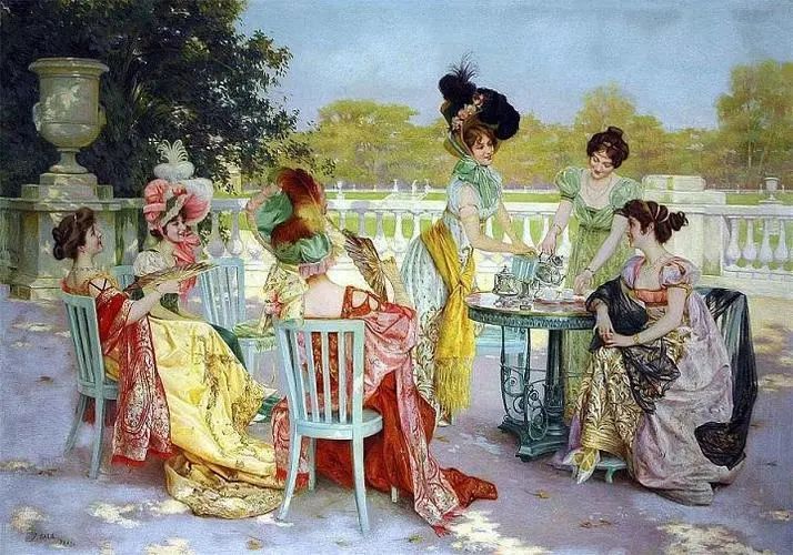 英国著名作家阿加莎在《五彩茶具》中描绘道:“茶会在草坪上进行。外景如此怡人,可以看见紫铜色山毛榉和黎巴嫩雪松……人们享受着草地那种柔和的绿色……天空如此婀娜多姿。”