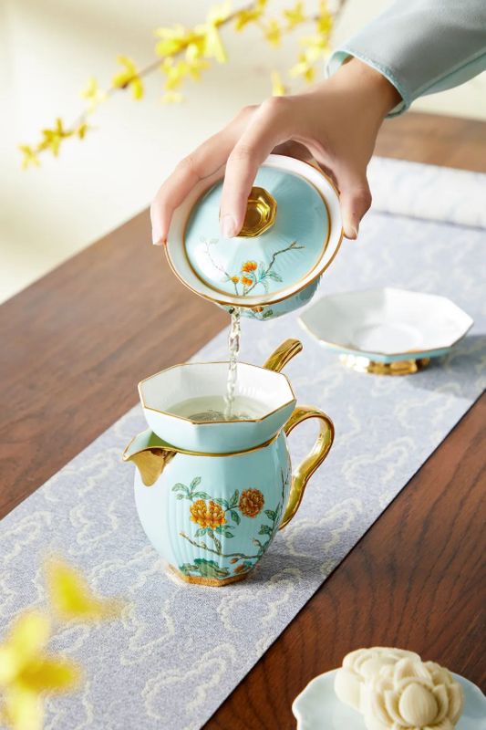 不管使用哪种方法拿盖碗,其盖碗姿势与公道杯要垂直。出汤时,将杯盖稍微倾斜,留出恰好出水的缝隙,又可以隔离茶渣。将中指和拇指放在盖碗边缘,食指轻压盖纽。三点一线,正好是盖碗的中心线。这样,动作优美,让人赏心悦目。
