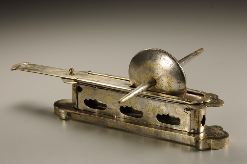 ▲唐鎏金鸿雁纹银茶槽子、唐鎏金团花银碢轴。(图片来源:法门寺博物馆官网)