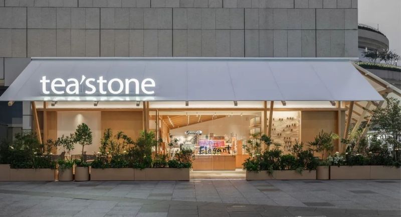 tea'stone成都店的外观设计便以茶铺的“斜撑凉棚”为创作灵感,轻盈灵动的浅色方木撑,结合tea'stone空间DNA中经典的纯白无饰大招展棚面设计,形成兼具中国记忆与当代美学的标志性空间符号。