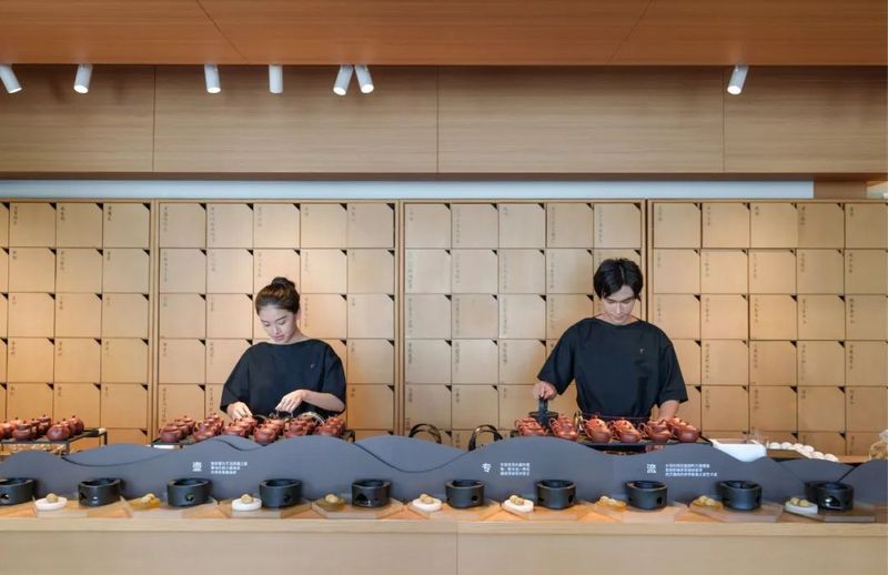 走入tea'stone的内部,最引人注目的是长达16米的大型情景化冲泡吧台,从汉唐炭火煮茶,到宋代盏泡,到明清紫砂壶冲泡和盖碗泡,再到现代智能化萃茶科技依次排列,是汇集古今经典茶法的专业泡茶台,也是一座展现中国千年泡茶史的情境舞台。