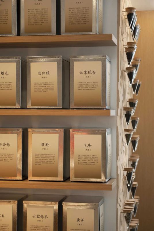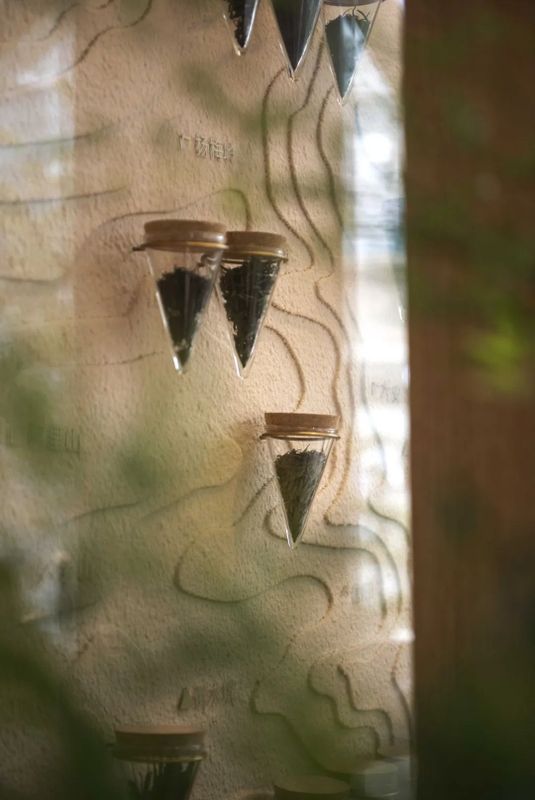 茶客们不仅可以在茶柜上阅读到每一款茶有关历史、风土、风味的专业资料,在茶山装置墙上找到茶叶对应的产区,看到茶园伴生植物的实体样本,了解到茶叶产地的气候地貌,还能在茶叶展示台细细品鉴茶的外观、色泽与气味,沉浸式地体验到中国茶丰富而多元的魅力。
