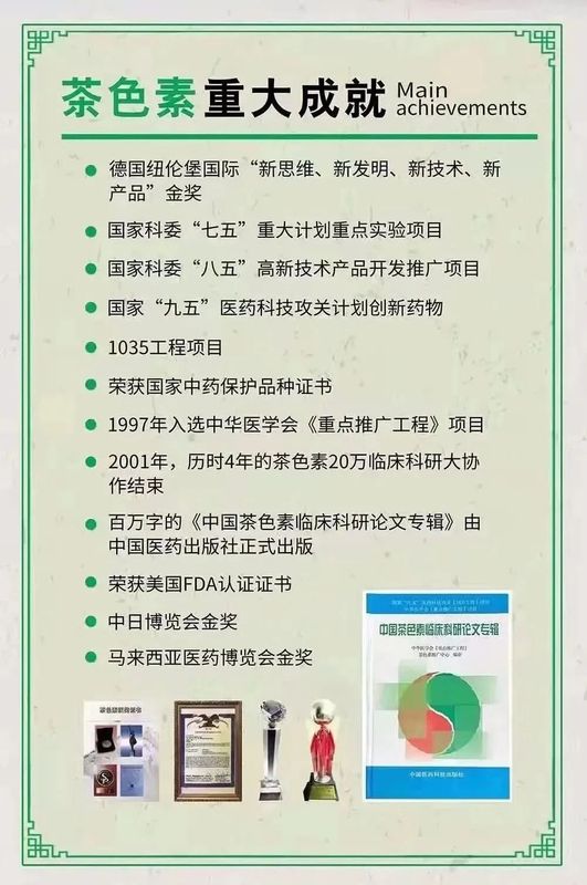 茶色素作为最新一代纯天然药用成分,具有广泛的治疗与保健作用,经临床验证:4800倍超剂量服用,不但疗效显著而且没有任何毒副作用。