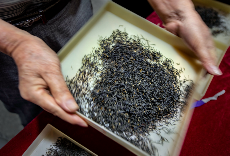 拣剔,俗称“择茶”。筛分后的茶,拣去茶梗茶枝,即成净茶。