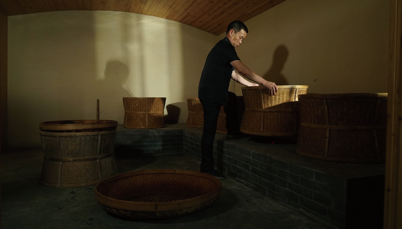 将揉捻叶轻放于箩筐中,厚约10厘米,每30分钟翻拌一次,待叶转红铜色,有明显的花果香即可。