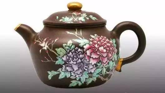 用低温釉色在紫砂烧成品上绘画出图案,在经八百多摄氏度二次烧成,此类作品壶身秞晶泛透,华贵富丽。