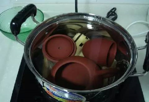 第四步:将煮好壶捞出来,待其自然冷凉直至没有热度。今后准备用此壶泡什么茶就准备什么茶叶,重新加入冷水将茶叶和壶一同放入锅内,待其煮沸,让厨房里充满了茶叶香味后10分钟或者更长时间,然后将壶捞出,用锅内的茶叶稍稍用力去摩擦壶体和壶盖数分钟,最后用温水把壶洗干净即可。