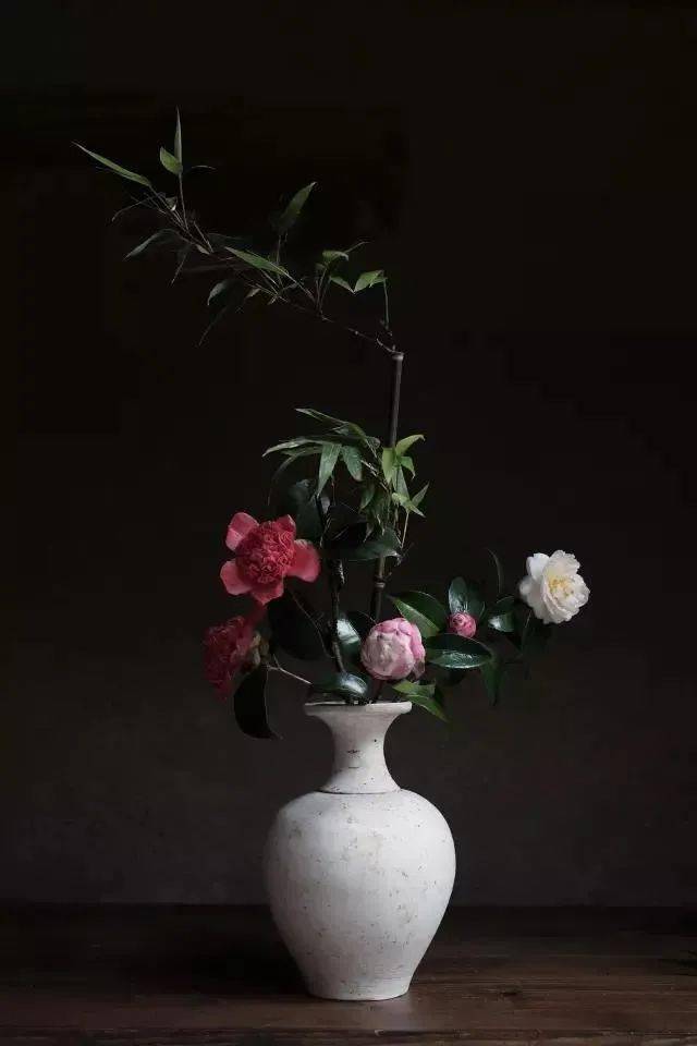 还有一次,丰臣秀吉命令利休在体型巨大的金瓶中插入红梅,正常的做法是将红梅根部沉入花器,表现花朵的美好。然而利休却反其道而行,将红梅枝条翻转,将花和花蕾插入瓶中,展现了根部与躯干的坚韧不凡。