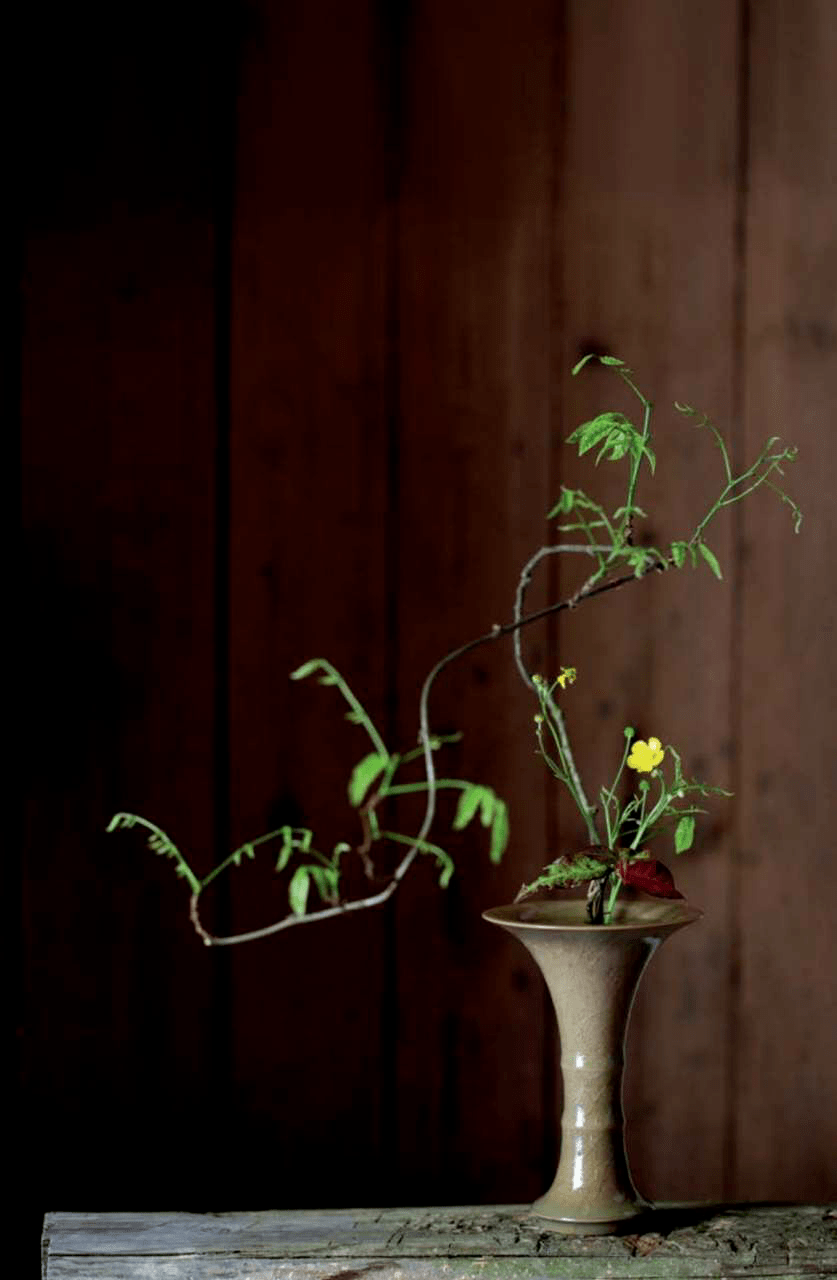 花,在茶道的世界中用于解读季节的转承变化,在整个茶道礼仪中担当着重要的角色。通常,在茶室的壁龛中,都会简单朴素地装饰有代表四季的应季花作。许多人认为这种在茶室中看似并无精心雕琢的花作,其实是通常所见到的刻意繁琐的花道作品的精简锤炼。