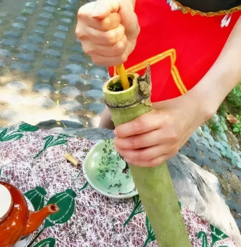 将茶鲜叶用锅煮或蒸,再放在竹帘上搓揉,然后装入大竹筒里,用木棒舂紧,筒口用竹叶堵塞,将竹筒倒置,滤出筒内茶叶水分,两天后用灰泥封住筒口。经二三个月后剖开竹筒,取出茶叶晾干装入罐中,加香油浸腌,可以直接当菜食用,也可以加蒜或其它配料炒食。