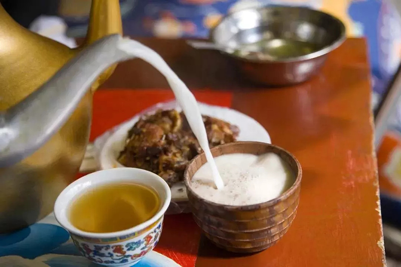 千百年来,藏族与茶结下了不解之缘,创造了独具特色的茶文化。对上门拜访的客人,藏族同胞首先会敬上一杯浓香扑鼻的酥油茶。出门远行时,家人或亲朋好友会提着酥油茶前来送行,祝福吉祥如意。
