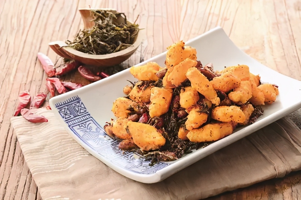 将包浆豆腐和普洱茶都炸好后,锅留底油烧热,下入豆腐、红豆、普洱茶,加盐、丘北辣椒面翻炒均匀,出锅装盘即可。炸好的豆腐外酥里嫩,而普洱茶也酥脆清香。
