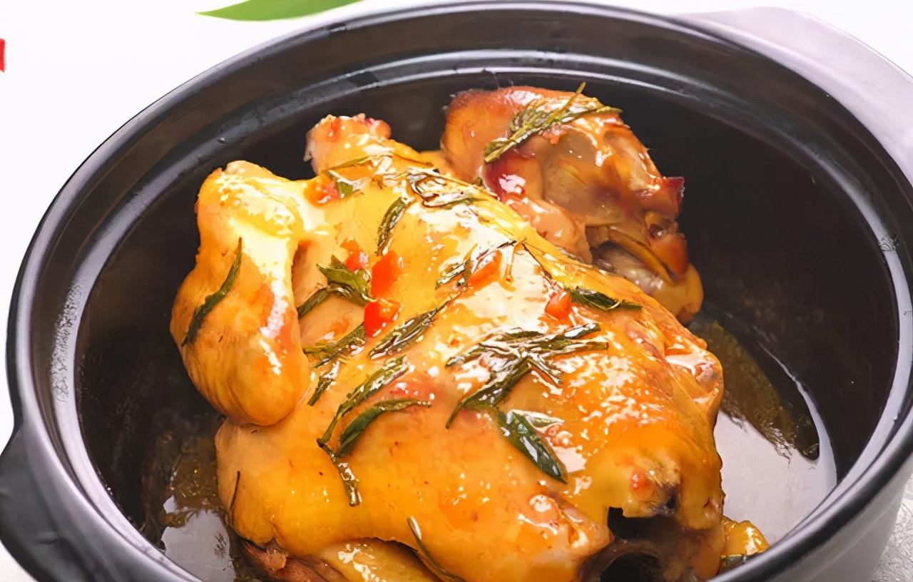 选用密封性良好,加热温度比铁锅高的砂锅,将腌好的鸡和调味汁倒入砂锅,再加入适量的水,水刚好漫过整只鸡即可,大火烧开后转小火。选用砂锅是因为砂锅能均衡而持久的把外界热能传递给内部原料,锅内形成相对平衡的环境温度,有利于调味汤汁与食物的相互渗透,能更大限度地释放鸡肉的味道。