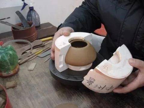 流把钮也借助模具完成后修整,而后用滋泥连接各部位,最后明针修整完成壶坯。