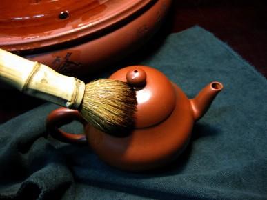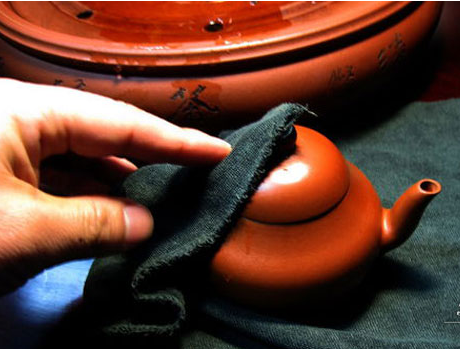 9、每次用完后,用纱布吸干壶外面的水分,接着倒出壶内的三分之二的茶叶,留下约三分之一,冲进沸水,焗两三次,冲过的水留用,然后清理干净所有的茶叶,将冲过的水浇匀壶上,最后用布轻轻擦干。