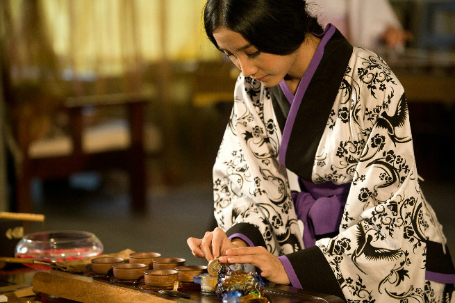 3、续茶礼仪往高杯中续茶水时,左手的小指和无名指夹住高杯盖上的小圆球,用大拇指、食指和中指握住杯把,从桌上端下茶杯,脚一前一后,侧身把茶水倒入客人杯中,以体现举止的文雅。