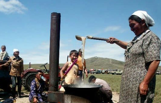 但是蒙古人却是一个例外。在蒙古人生活中有着这样一句话:可以三日无饭,不可一日无茶。每日清晨起来,主妇们先煮上一锅咸奶茶,供全家整天喝。蒙古族人民喜欢喝热茶,早上一边喝茶,一边吃炒米。早茶后,将其余的咸奶茶放在微火上暖着,以便随需随取。
