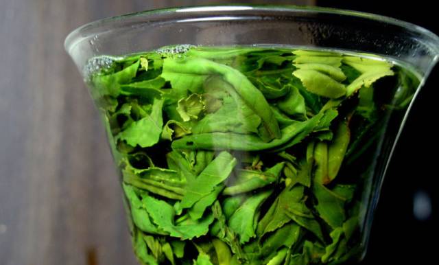 茶叶泡完后,新茶茶底绿中带黄,显鲜嫩,而隔年茶茶底偏黄,没有鲜嫩感。