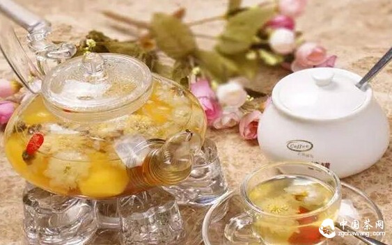 用开水冲泡茉莉花茶时,放入五六朵白菊花,也可以再加几颗同样有滋补肝肾功效的枸杞,使花茶明目的作用加强。