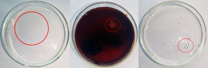 在培养皿中加入等体积纯水、益原素茶汤、洗涤剂溶液,于溶液表面加入0.1 mL食用花生油并均匀搅拌后静置15 min,观察搅拌前及搅拌后油滴聚集情况。