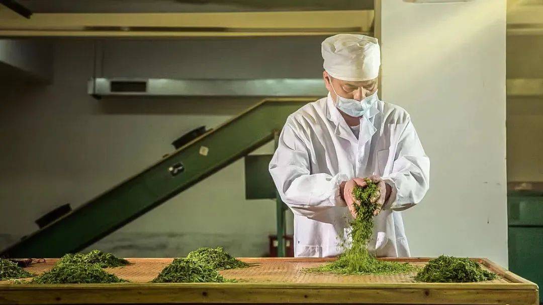 采用冷揉,是形成雨花茶紧细圆直的关键工序,要求紧条、细条、圆条,揉捻后,细胞破壁程度高,滋味更加醇和。