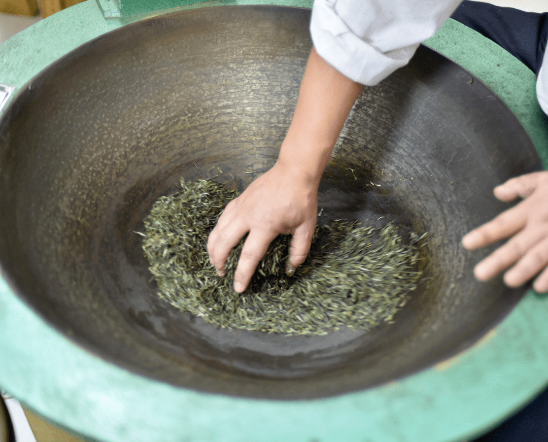搓条是塑造雨花茶形状的主要工艺之一,锅温要求先高后低,从80℃至50℃。搓条时手心满握茶叶,掌握轻——重——轻的原则。搓条目的是进一步完善紧、细、圆的效果。