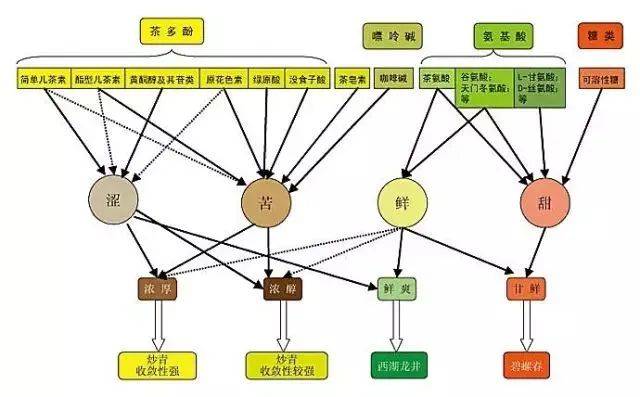 从科学上来说,茶汤中的呈味物质归纳起来可分为:糖类、氨基酸、酚性物及其氧化产物(主要为茶多酚)、嘌呤碱(以咖啡碱为主)和茶皂素等。