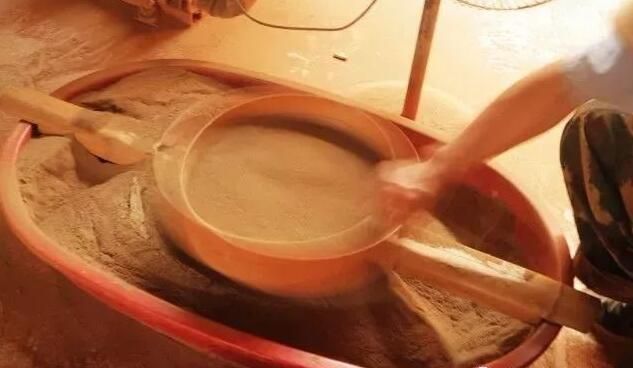 研磨,把筛选出来的矿料,放进石磨中磨粉,这是手工古法的做法,要么用石磨磨,要么就是用的硬物捣,磨出来的粉末,再过筛,拿一个筛网,反复过筛,筛网有目数这一说,目数越大,筛选出来的粉末越细,目数越小,粉末越粗,一般手工研磨的,泥料都相对粗一些,但透气性是比机器研磨的会好很多。