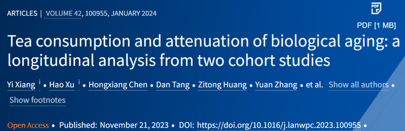 2023年11月21日,四川大学华西公共卫生学院赵星教授团队在国际著名期刊《柳叶刀》子刊quot; The Lancet Regional Health-Western Pacific quot;(IF=7.1)上在线发表了一篇题为quot; Tea consumption and attenuation of biological aging:a longitudinal analysis from two cohort studies quot;的研究论文。结果表明,经常喝茶可以减缓衰老进程,每天喝大约3杯茶或6-8克茶叶可能提供最显著的抗衰老效果。