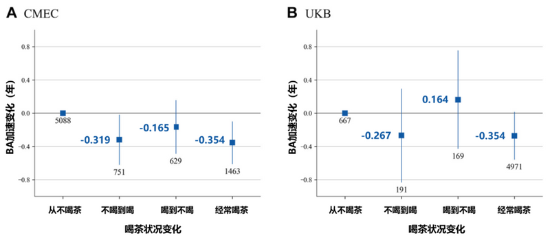 在中英两个队列中,与从不喝茶的人相比,不喝到喝的参与者衰老速度明显变缓,两个队列中分别减缓0.319年(CMEC:β=-0.319,95% CI:-0.620~-0.017)和0.267年(UKB:β=-0.267,95% CI:-0.831~0.297);相反,与经常喝茶的人相比,从喝到不喝的参与者衰老速度增快(CMEC:β=-0.165,95% CI:-0.487~0.158;UKB:β=0.164,95% CI:-0.428~0.756)。所以,想要“活得久”,不妨试试喝茶。
