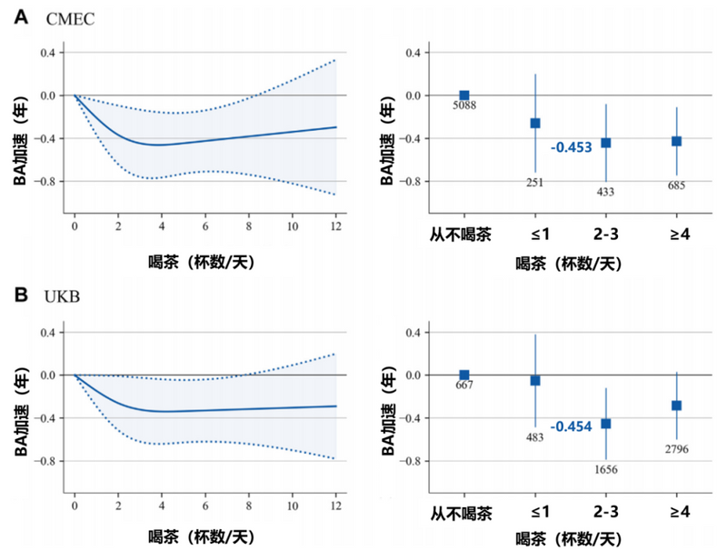 在两个队列中,研究结果显示,每天喝大约3杯茶时,衰老速度最低,之后趋于稳定。与不喝茶的人相比,每天喝2~3杯的人抗衰老效果最佳(CMEC:β=−0.453,95% CI:−0.815~−0.090;UKB:β=−0.454,95% CI:−0.788~−0.121)。