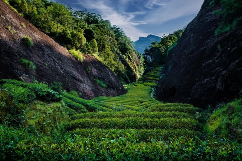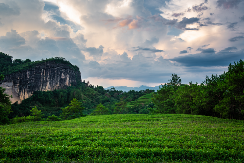 武夷山典型的丹霞地貌不仅令游客流连,也造就了这里独特的茶香。武夷山山高谷深,云雾缭绕,丰富的漫射光也非常有利于茶树生长,促进了茶叶中氨基酸、咖啡碱的合成,凸显出茶叶内的芳香物质。