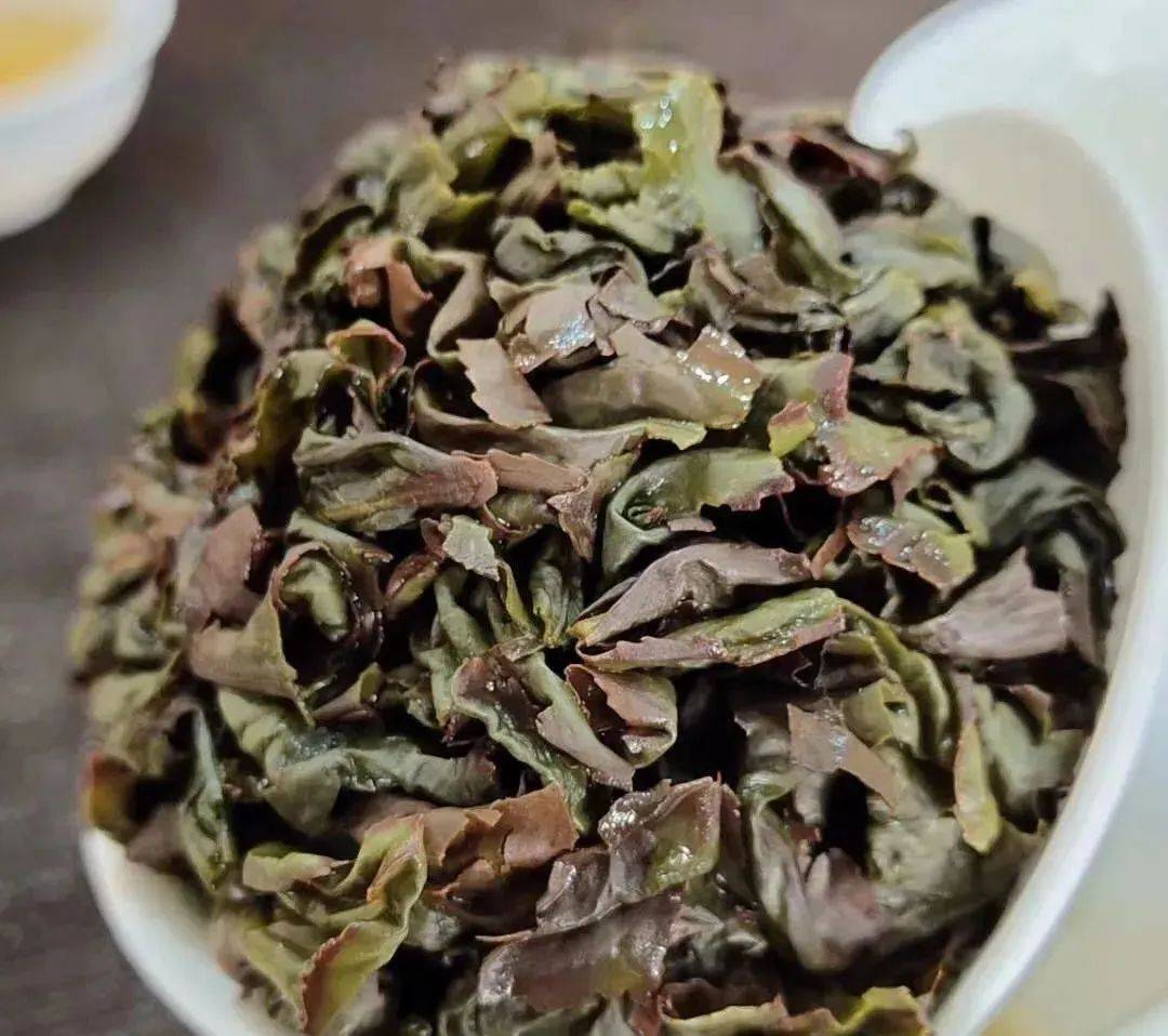 传统铁观音表现为:颗粒呈半条索状,较为弯曲紧结(如“蜻蜓头“),梗皮红褐亮;色泽乌黑发亮,红点明显;香气浓郁,音韵明显,带兰花香;口味醇厚,回甘持久;汤色呈橙黄色,有的偏深;叶底色泽偏深,主要呈墨绿色,叶面往往为绿叶红边,色泽均匀度要求较低。