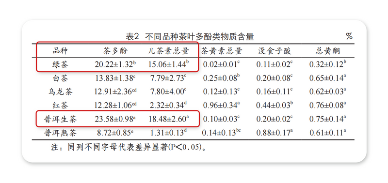 结果证明,在五大类茶叶中,普洱生茶茶多酚含量显著高于其他类茶叶,达到23%以上,绿茶次之。同样,普洱生茶儿茶素总量达18%以上,显著高于其他茶叶,绿茶次之。(见下图表2)