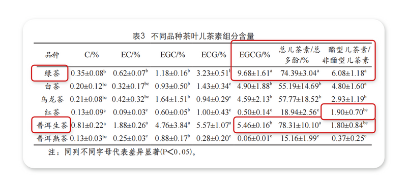 绿茶和普洱生茶同为未发酵茶,茶叶中儿茶素总量占总多酚比例都高达70%以上,其中普洱生茶最高,达78%以上,绿茶次之。两者在儿茶素各组成部分比例也存在较大差别:绿茶中EGCG含量最高,其他成分偏低,各成分占比有较大悬殊。普洱生茶中EGCG、ECG、EGC所占比例则较为均衡,这种差异很大程度上在于两者茶树品种的不同。(见下图表3)