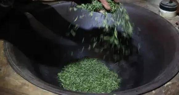 8.再干:然后将初干后的绿茶放在铸铁锅内炒干,锅温90℃-100℃。待叶子受热后,逐渐降低至60℃,炒至含水率6.0%至6.5%,出锅倒入竹匾,待冷却筛去粉末,即可包装储藏。