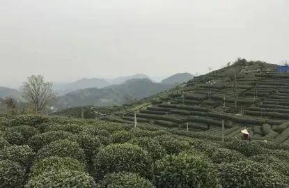 茶树外形对比,照片中远处山坡上的龙井43号比较整齐,而近处群体种一簇一簇的。这两个品种的茶树还是比较容易区分的。