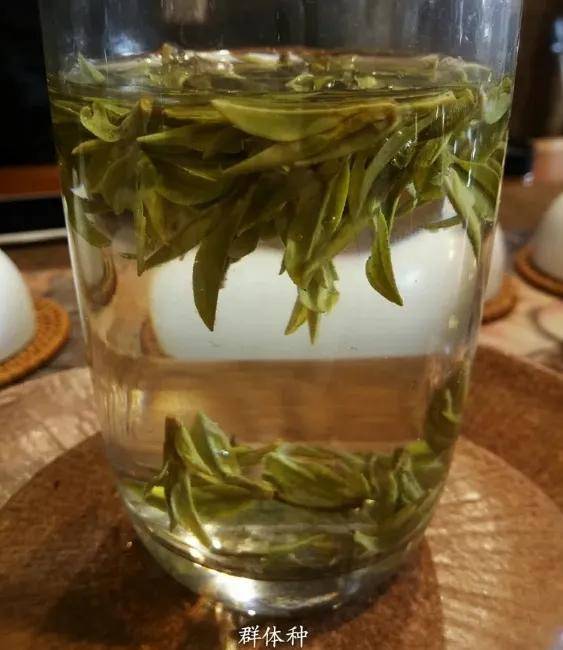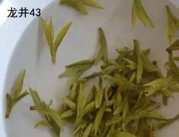 龙井43号的叶子即使浸泡过热水,还是细细长长的,似乎怎么泡也不会伸展开;而群体种的茶叶浸泡过热水后,会完全伸展开,看上去肥肥大大的。