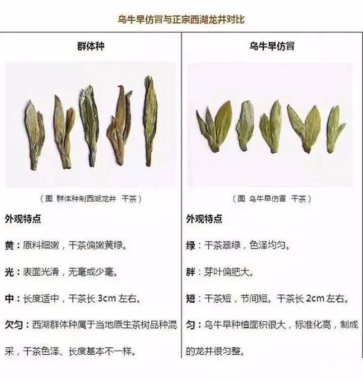 ①乌牛早属于特早发芽的茶树品种,比群体种早发芽一个月,是龙井仿制最爱使用的品种。②西湖产区只种植四大茶树品种:西湖龙井、龙井43号、龙井长叶、迎霜。除这四大品种制作的是西湖龙井外,其余风味上有一定区别,目前不被列入正宗的西湖龙井名录。③乌牛早价格便宜,2021年价格约为300—500元/斤,仿冒西湖龙井利润空间很大。