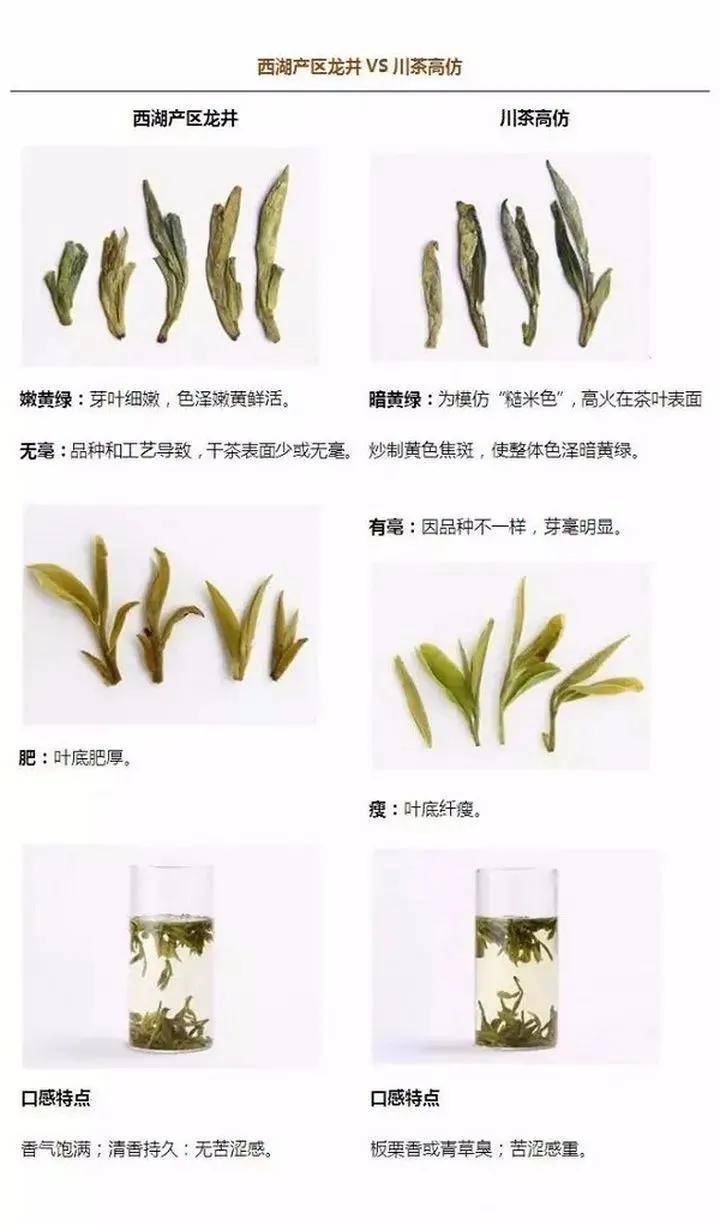 ①用四川茶原料,龙井茶的工艺制作的扁形绿茶。②西湖龙井以早为贵,而川茶、黔茶采制时间比西湖地区早,商家常用川茶(或黔茶)进行仿冒,多见早春西湖龙井中。③高等级的川茶版龙井,外形近似,价格偏高,一般较难分辨,但川茶的苦涩口感明显,可以由此加以区分。
