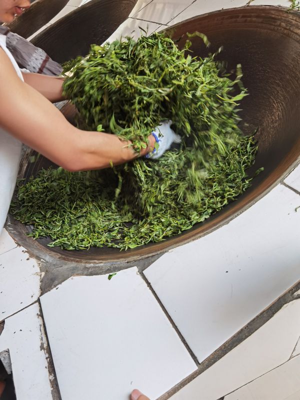 杀青,即炒熟摊晾好的茶叶,要求对火候和时间的控制恰到好处,采用抖闷结合的方式,使鲜叶均匀失水,每一片都杀匀杀透。