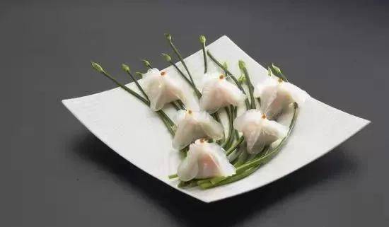 例如:水晶蝴蝶饺,欲语还羞般晶莹剔透,待饺子蒸熟后快手插上去鱼翅翅针制的“蝴蝶须”,惟妙惟肖,正是妙笔。全素的馅料隔着透明的薄皮现出缤纷色彩,令人赏心悦目。